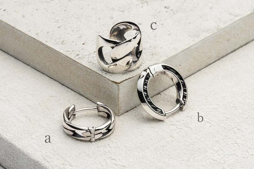 - 【耳環(穿孔)】相較於女性常見的夾式耳環,男性多半是穿耳洞配戴耳針。