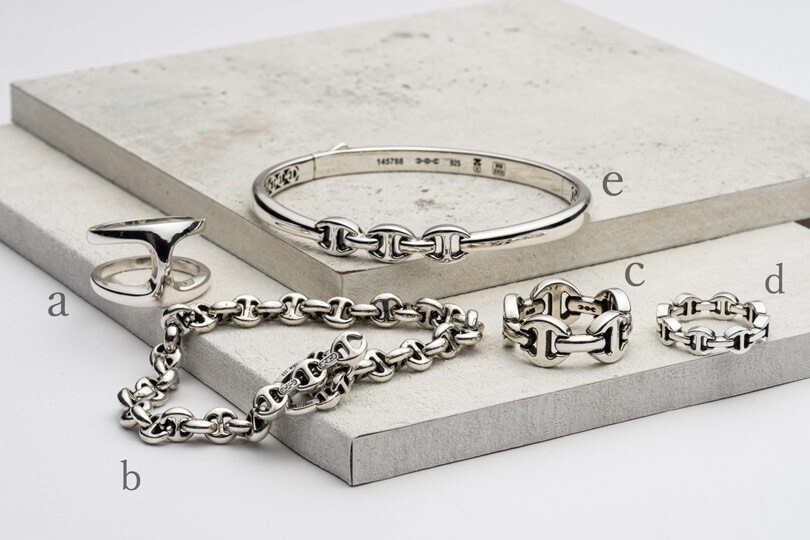 LA 品牌<HOORSENBUHS/ホーセンブース>以錨鍊設計聞名,飾品之間互相搭配也很耐看。