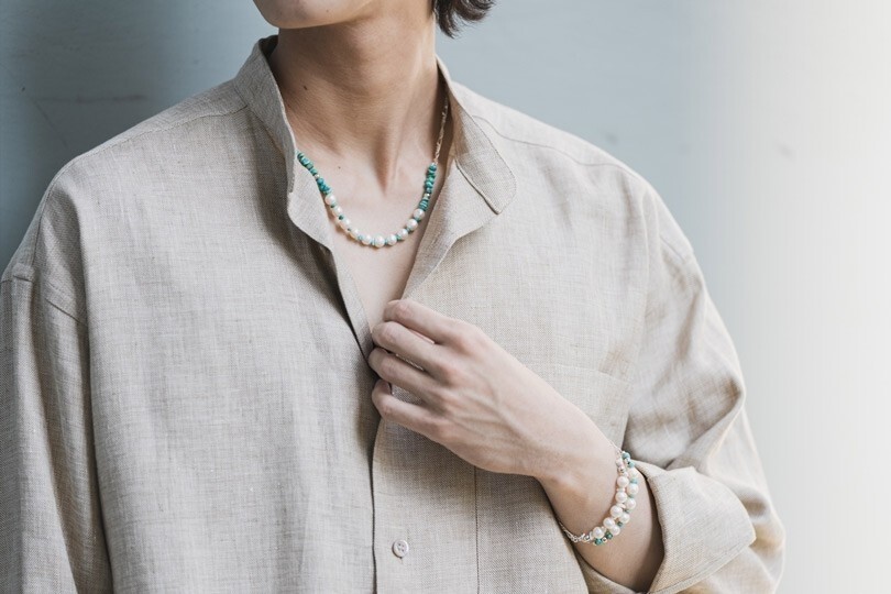 短袖襯衫配短褲時,飾品選擇偏輕盈、有擺動感的款式最適合。近期男士珍珠飾品也是一大趨勢。