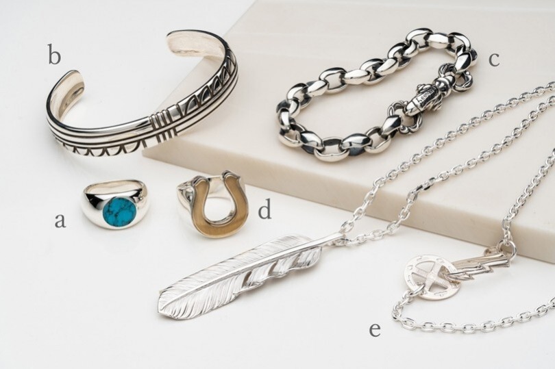 - 【銀飾】以印地安風格為代表的銀製飾品。純銀偏軟、容易變形,因此多半使用加入其他金屬的「925 純銀」。配戴久了會自然氧化變色,可以選擇保留這種味道,或定期拋光維持亮白。